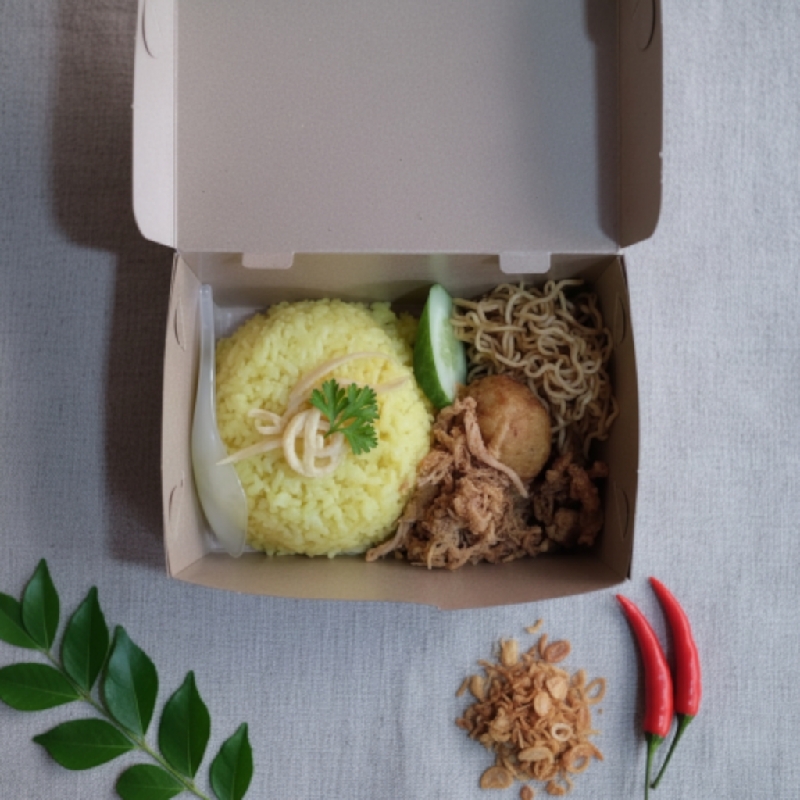 Setiap box berisi nasi kuning gurih, ayam suwir lembut berbumbu khas, kering tempe, telur, sambal, dan pelengkap segar — cocok untuk acara besar maupun kecil.